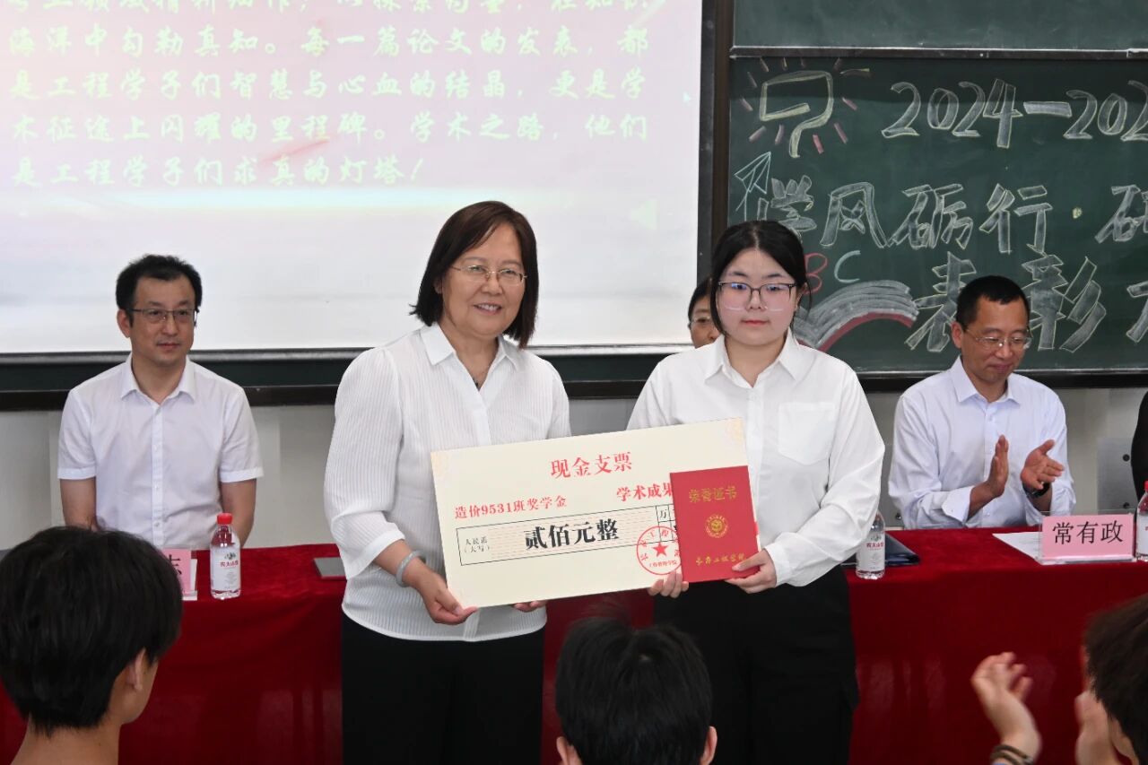 “造价9531班奖学金”对本次受表彰的先进个人予以奖励,造价9531班校友钟智群代表造价9531班全体校友,向全院同学提出几点希望。一是坚持做难而正确的事。清晰的价值观和原则是坚持不懈的基石,同学们要在各自的领域深耕,确立好自己的目标并为之努力,坚持不懈,必有回响。二是坚信努力的意义。只有不断地学习,才能让我们对这个世界的认知有更高层次的理解。造价9531班校友们在学生时代就坚定学习的信念,坚持学习不停歇,现在都在各自的领域有所成就。三是坚定自己的人生方向。要根据自身特点、擅长领域树立正确的发展目标,锚定方向,专注自己,才能从容不迫地向着目标靠近。